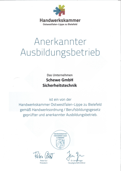 Die Schewe GmbH Sicherheitstechnik investiert seit Anfang an in die Ausbildung junger Menschen. Die Handwerkskammer hat nun bestätigt, dass das Unternehmen seit 6 Jahren regelmäßig mindestens einen Ausbildungsvertrag abgeschlossen haben.